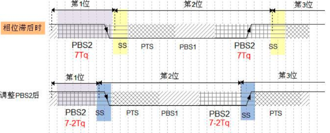 2 存在一个阶段滞后。 当控制器在前面的 PBS2 段降低 2Tq 长度并同步时, 节点在线边跳跃中被识别, 相对于总线的 2Tq 时间序列的时间序列滞后 。