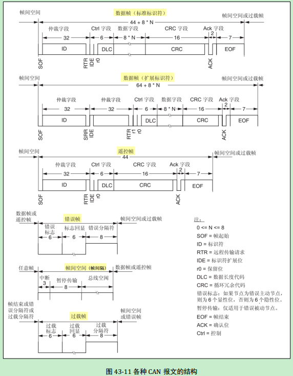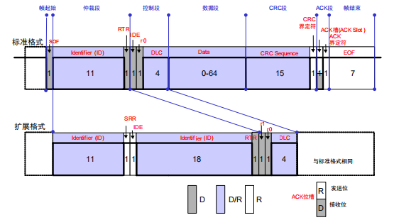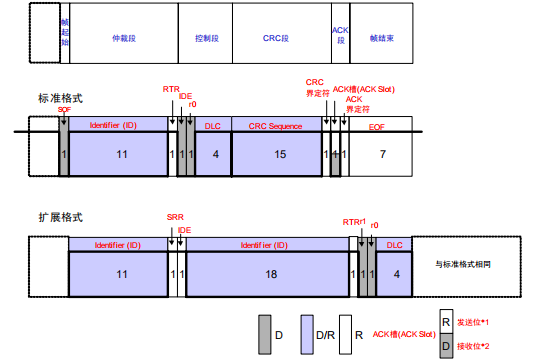 此外,数据框架和远程框架以两种标准形式和扩展格式提供,标准格式包括11位ID(识别符:后来称为ID),扩大格式包括29位ID。