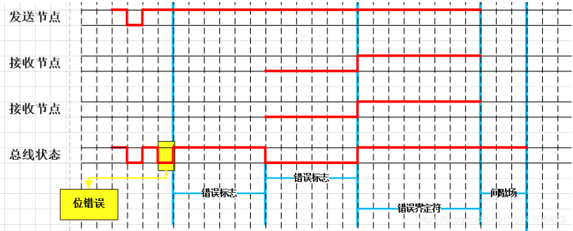 公交车的节点都处于主动误差状态。(b) 当传送节点监测总线上若干位数且与传送的位数不符时,发现错误并发送主动错误指示(6个连续可见的位置);当收到通过发送节点发送到六个连续可见位置的节点时,发现字段填充错误,并传送活动错误标记。当通信节点发送活动错误标记时,您开始检查公交车是否被隐藏,如果是,您开始发送错误的分隔符(8个连续隐藏的空格)以发送活动错误标记,您开始检查公交车是否被隐藏,如果是,您开始发送错误的分隔符(8个连续隐藏空格);接收节点已传送活动错误标记时, 开始向总线发送错误分隔符; 等待错误框架完成, 在再次发送错误消息前总线为空 。随着传输节点发送六个连续可见的位置,比特填充规则被违反,导致接收节点发出主动错误信号,而发送和接收的节点被合并是错贴标签的原因。
