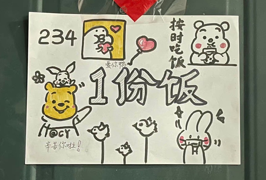 一些人表示对志愿工作感兴趣。在送餐时,人们经常在卧室门上看到一张纸。它提到宿舍的膳食要求。例如“早餐2份,午餐2份,晚餐1份”。但除此之外,在纸面上,学生们还画小兔子、鸟类和维尼熊。在现实中,用粉笔和红笔来传达爱是不可能的。相反,在报纸上画一个有趣的表情。最后,他们总是说,“多亏了志愿者!”辛苦了!”“记得按时吃饭”。郭昊雯说,即便有这么小的问题也使他们感到极度的热。
