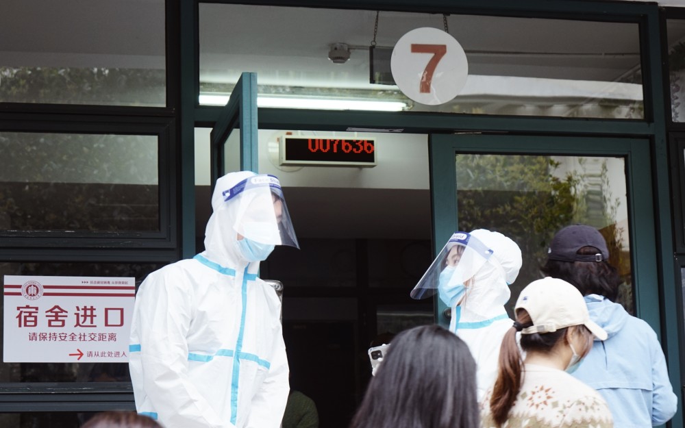 当核酸正在测试时,学校志愿者正在宿舍建筑群入口保持秩序,敦促学生清理他们的卫生守则。