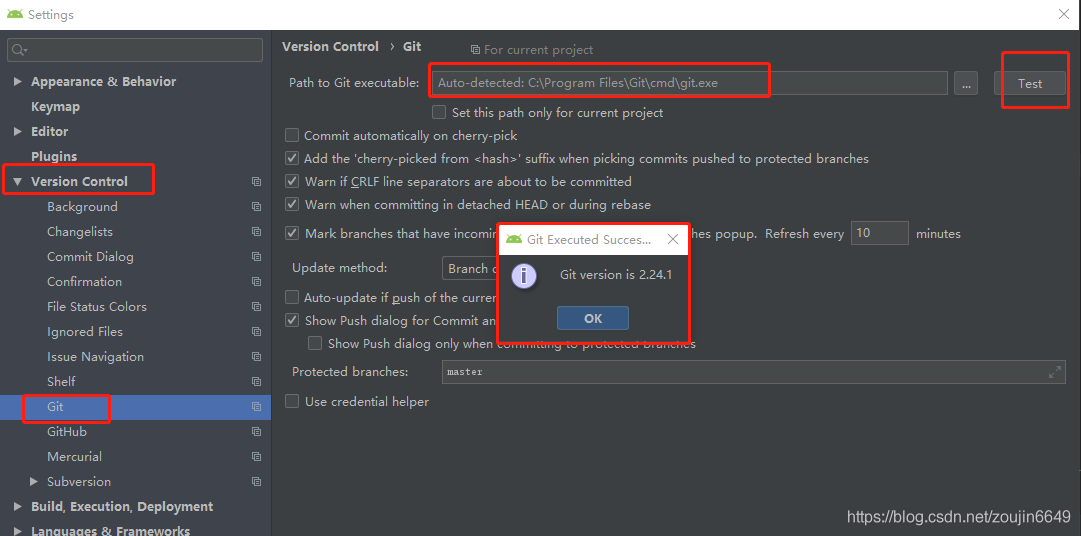 安装完成后 Android演播室将确认安装的 URL 并检查 Git 版本 。
