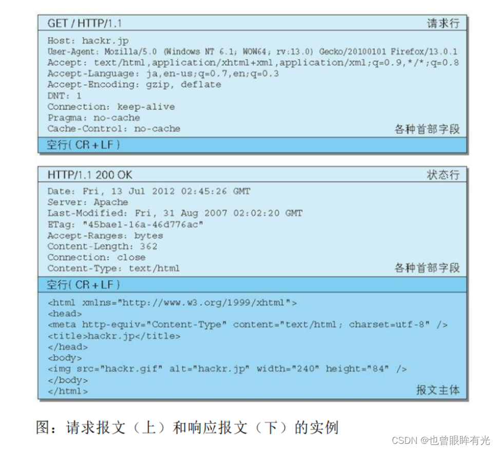请求者( 客户) 的 HTTP 信息被称为请求信息, 而服务器的 HTTP 信息被称为回复信息。 HTTP 信息本身是由多行数据组成的字符串文本( 使用 CR+LF 作为换行符 ) 。