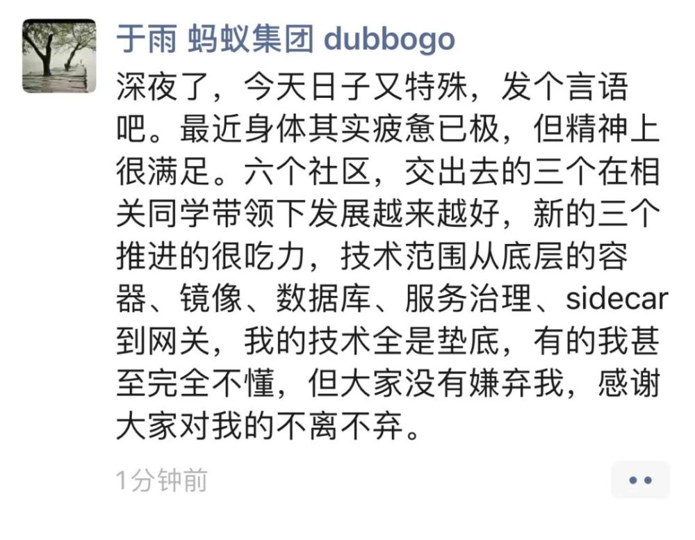 2018年底,当蚂蚁急于确定云基技术的路径并大量投资于这些技术时,于雨决定加入其中。在此之前,Dubbogo在雨中做了很长时间。他声称自己是蚂蚁,称自己是蚂蚁。然而,Dubbogo当时并没有现今的“可见度”。Dubbogo只是作为他在早些时候在雨中工作时完成的主动行动之一,被列入他的简历。