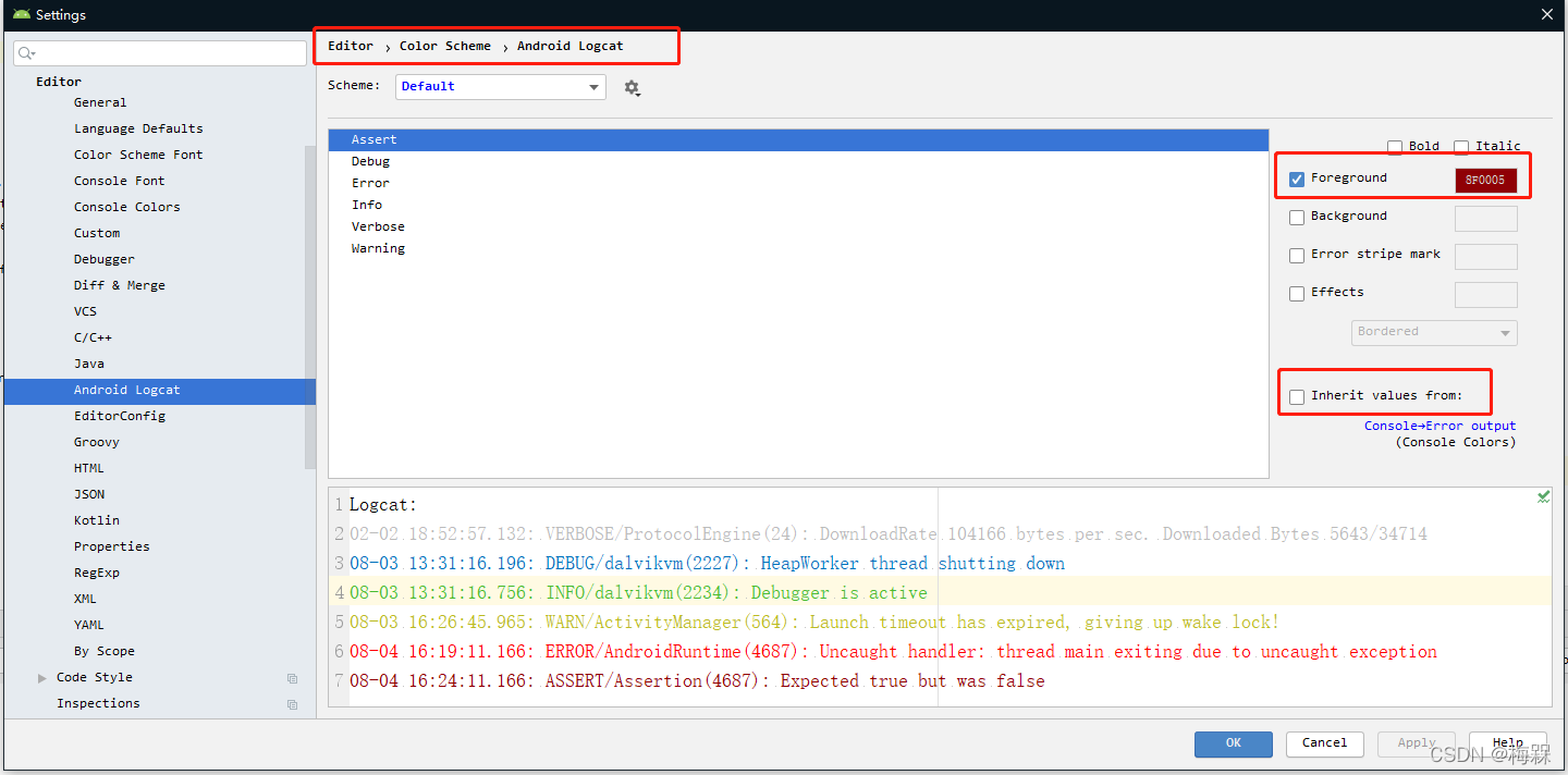CTRL+ALT+S 打开设置, 并选择“ 继承.. ”, 更改不同日志水平的颜色 。