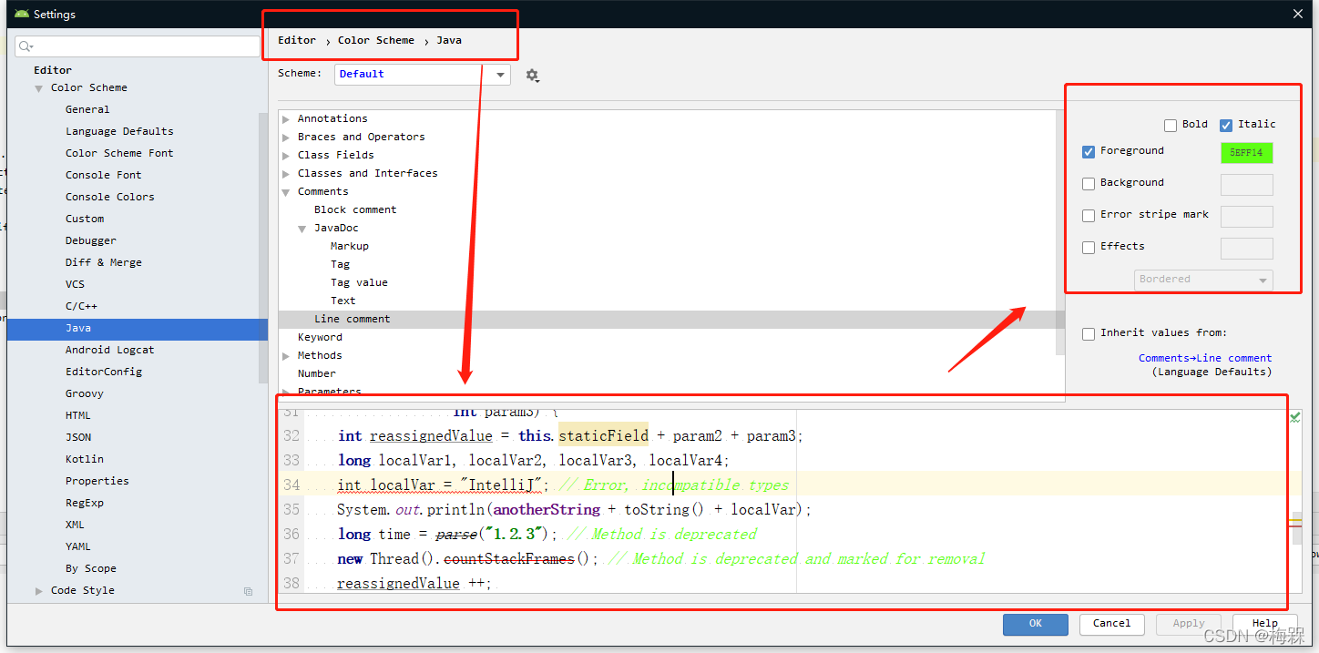 要更改注释的颜色, 请直接单击下面的代码框, 选择注释, 然后转到注释的颜色编辑处, 全部都是相同的 。