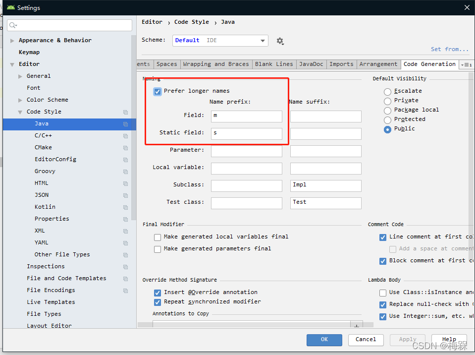 将名称前缀 m 和 s 添加到文献目录中,作为外地成员变量和静态实地成员变量