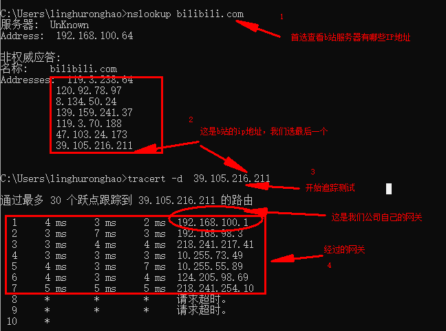 如果计算机1希望访问B站,它必须首先通过总机、网关和猫,详情如下: