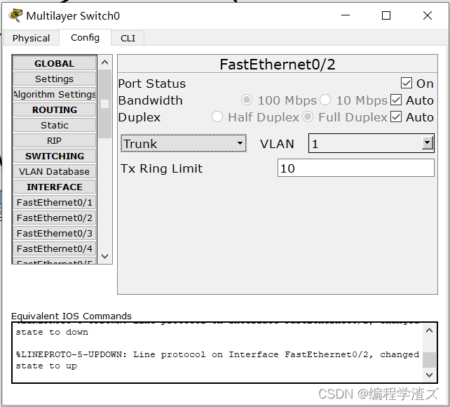 点击多层开关, 然后拆分 vlan 并配置连接到 Trunk 的连接, 这将默认通过所有端口, 即公交车模式的配置 。