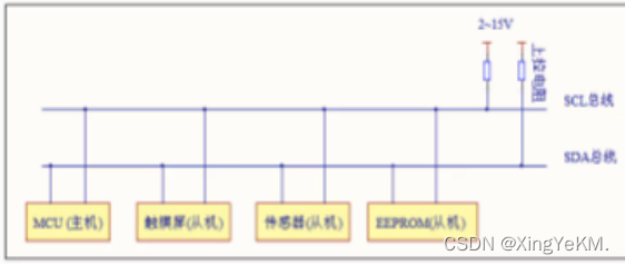 四条主线通过上下拉动获得电源。 当 I2C 设备闲置时, 它会生成一个高配置, 当所有设备都空闲时, 它会被电阻力推上, 电阻力将公交车拉到高水平 。