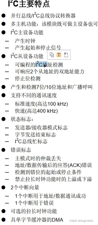 通信停止信号、数据有效性、回应、仲裁、时钟同步和地址广播均在I2C协议中界定。