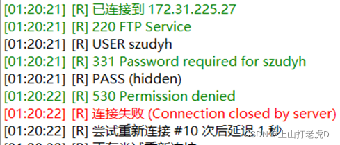 之后,如图21所示,利用FlashFXP软件重新建立了与服务器的连接,发现服务器拒绝连接,连接失败。