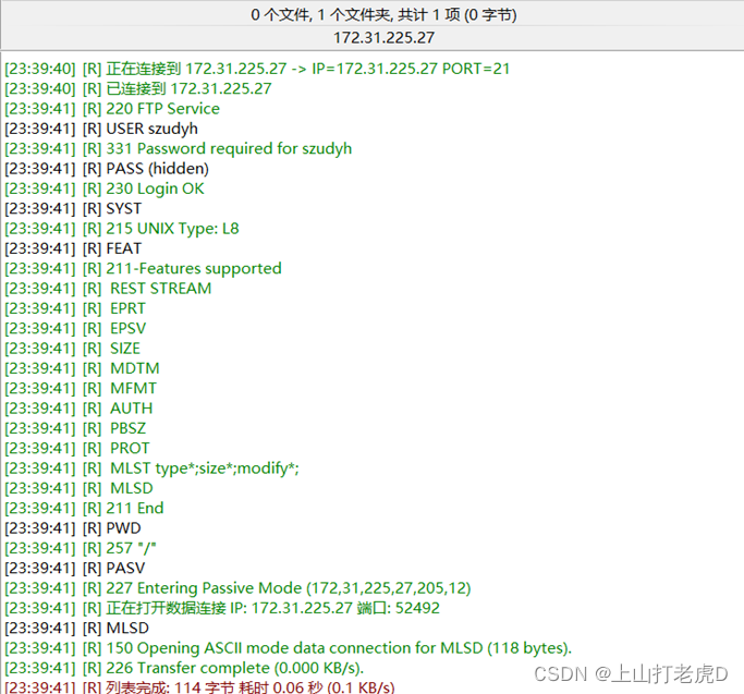 可以看到,客户端最初要求服务器登录的用户名是 szudyh, 服务器通过请求密码回答。 本地客户端然后将用户密码发送到服务器, 服务器提供230个状态代码以证明登录 。