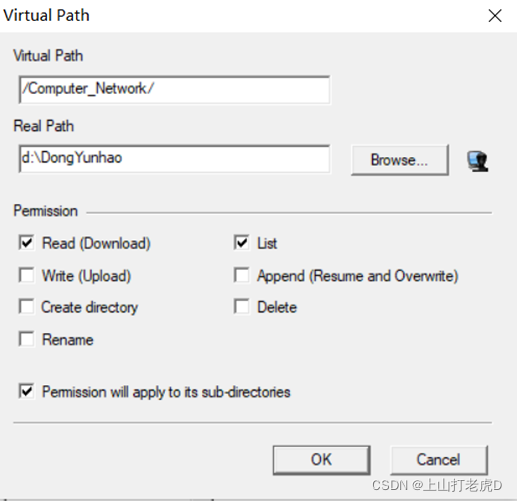 如图22所示,将用户访问目录更改为磁盘D上的“DongYunhao”,并将读写权和写权修改为可读性而非可写性。