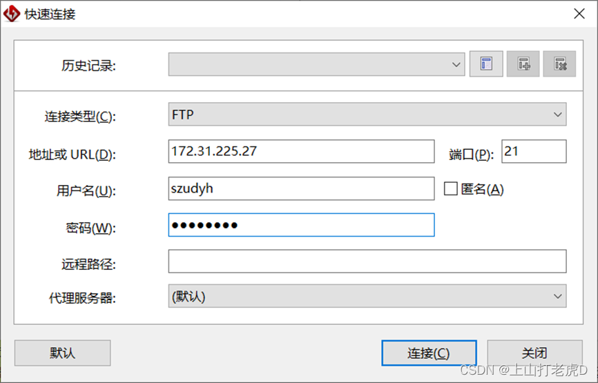 然后,客户将连接,第一种选择是快速连接,输入相关地址、端口、用户名和密码: