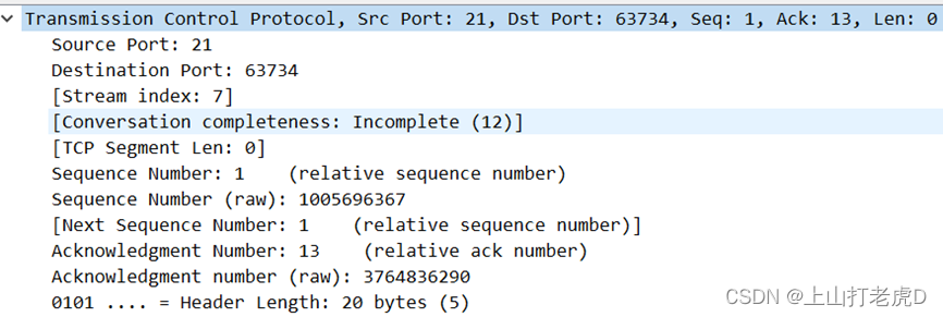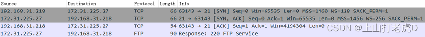 跟踪TCP流时使用Wiresark,下文图25中的数据包提供了TCP三次握手请求,从基于TCP的FTP中可以看出,最后一个数据包包括服务器向客户提供的信息,以及状态代码220信号服务准备状态。