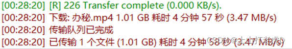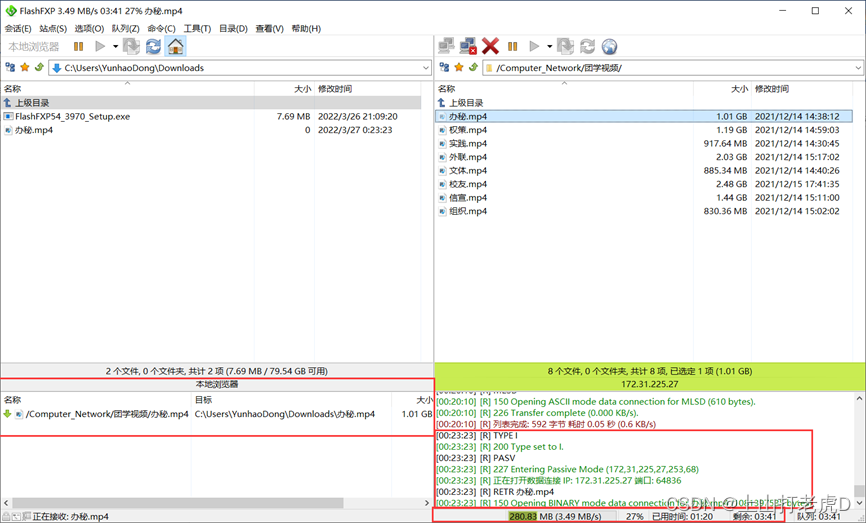接下来,我们将进行上传和下载测试,下载, 然后选择“ 秘书 ” 。 “ mp4 拖到左边, 释放鼠标, 如图16中的红框所示, 正在下载, 下载时间, 传输速度 。 ”