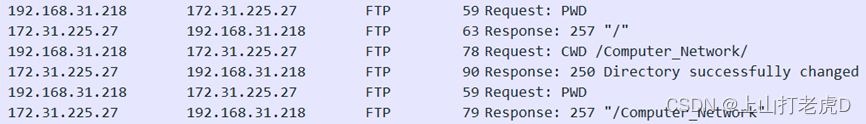 在此之后, 将创建文件路径, 如图 28 数据包 PWD 请求打印工作目录。 服务器通过返回当前工作目录回复当前工作目录, 路径名称为 " / " 。 数据包 CWD 然后更改工作目录, 显示文档行为已经完成 。