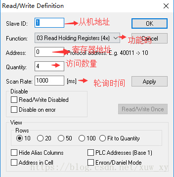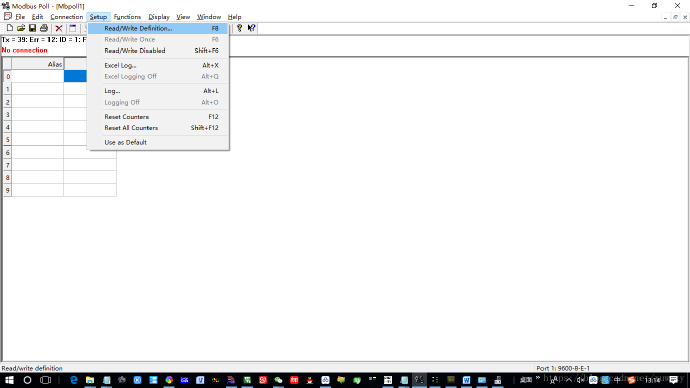 另一方面,必须访问已经安装的摩布斯民调和摩布斯奴隶软件。分别按“F8”或者点击setup->read/write(主机)/slave(从机)definition配置主从端的相关配置,如图: