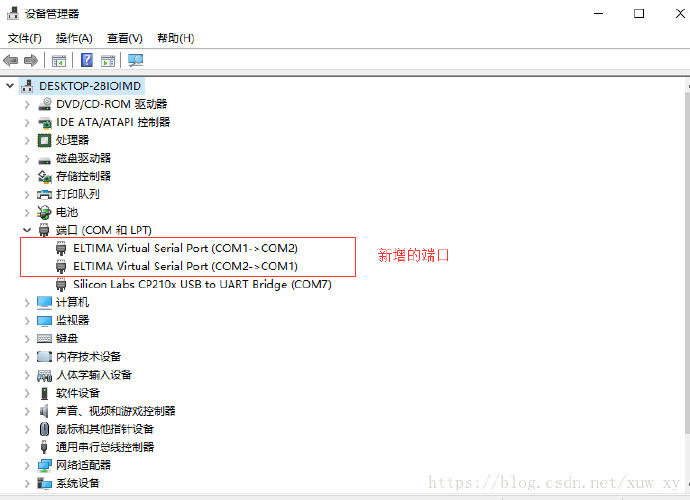一次可以添加两个端口,我添加了com1和com2两个端口。在电脑设备管理器->端口中查看是否新加了两个端口: