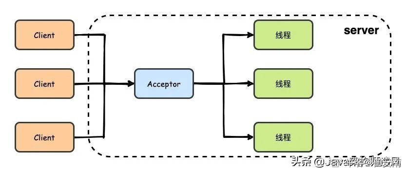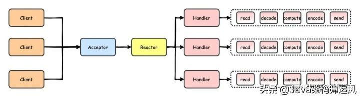 NIO:同步非阻塞IO,它是围绕反应堆模型建造的。频道与客户连接。如果你想读写,你可以这样做。另一方面,一个多路中继器选择器被问及频道在它上的注册情况。然后还有IO行动。这样的话,只要添加另一条线即可处理 IO 活动 。也就是一个请求一个线程。