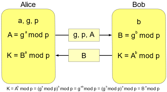 下图描述了Diffie Hellman协议的逻辑。该协定将需要得到广泛执行。为了方便,您可以使用 libgmp 来操作 。它可以产生大量数量,检查大量数量是否是一个质数,进行大量数量的基本操作等等。图书馆可用于计算起始质量 p。并计算原根 g,然后随机生成双端私人密钥a和b。此外,还使用建模来计算公用钥匙A和B。交换公钥后,您可以使用调制解调器计算最后的密钥 K 。K在两端都应该是相同的。