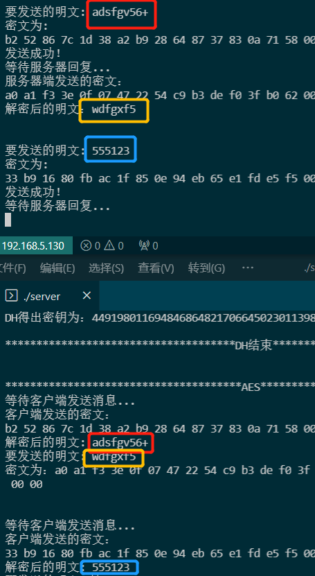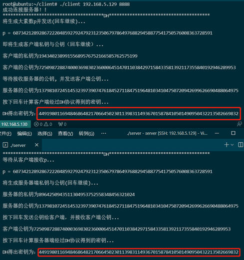在开始通信时,客户端创造了大量质量 p.发送给服务器保存,然后,他们建立自己的私人和公共钥匙。并交换公钥,最后, AES 加密密钥已计算 。并互相发送消息。进行中间人攻击时,亚普波夫应首先用于双向中毒:Arpspoof - i 网卡(例如, ens33) - t 客户 IP- r 服务器 IP,然后开始中间程序。中间软件后台运行以在同一目录下写入客户服务器连接的内容。txt 文件定期被篡改,尽管这在大部分时间都是典型的。