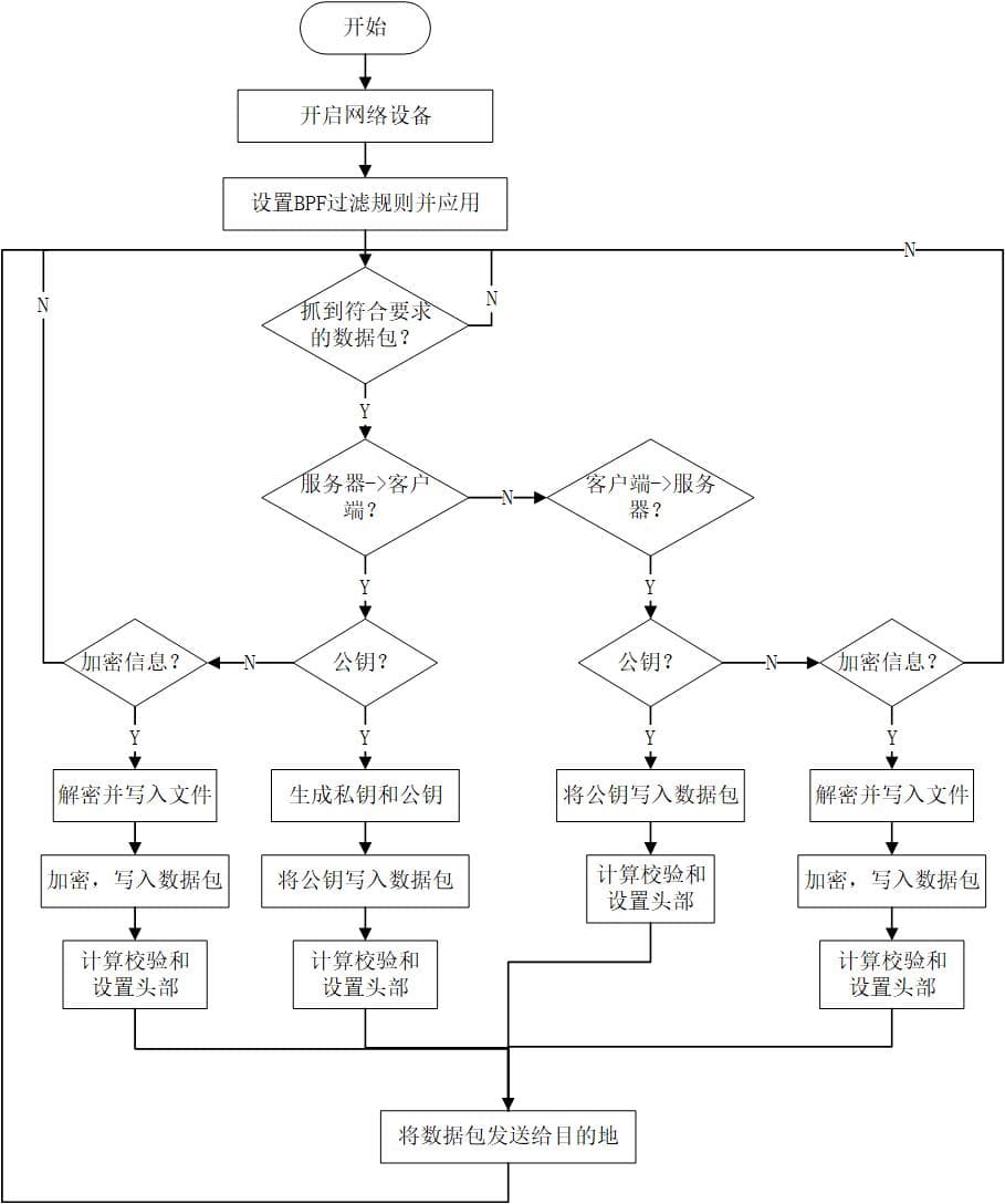 数据关系:监听网卡,调用 Diffie Hellman的结构中的函数用于和客户端、服务器分别建立信任关系;调用 AES 结构对提取到的密文进行解密和加密。