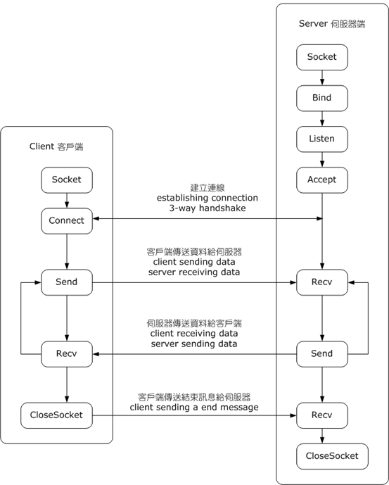数据关系:服务器绑定端口号码并监听它,等待客户端连接;客户端试图连接所提供的 IP 的指定端口号码,成功连接可以互相互动。