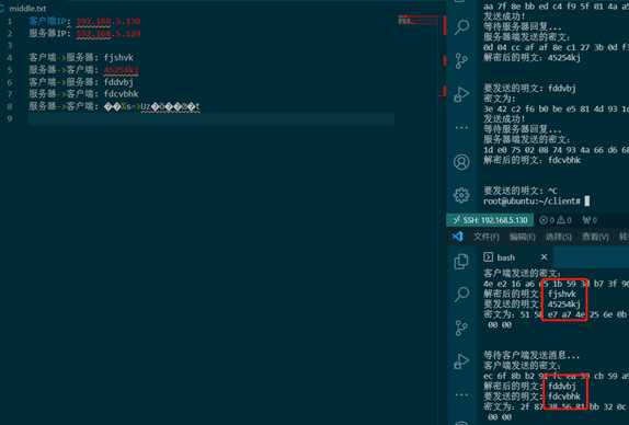 让我们从美国革命党的欺骗攻击开始然后开启服务器,让中间人(后台运行)进入。最后开启客户端。和第一阶段一样 在迪菲・赫尔曼协议之前不再赘述,直接看加解密。最后一次骚动是"Ctrl+C"您可以将书面文件与相关客户端服务器给出的明确文本进行比较,以此验证书面文件。