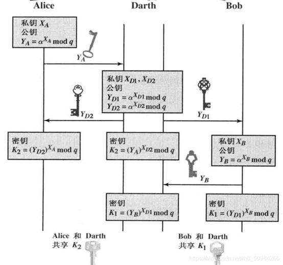 由于软件包作为公用钥匙交付,被拦截时,中间人视其为服务器发送的公用钥匙,重新生成私人钥匙和公用钥匙,并将其传送给客户,客户当然不会从服务器获得任何字符串。