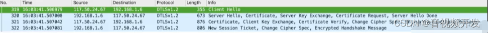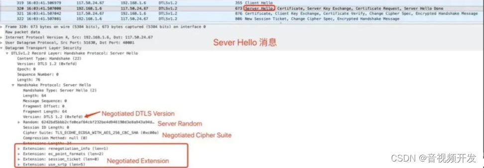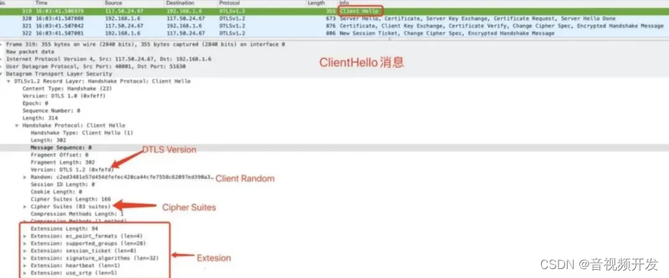 Clieen Hello和Server Hello 查查版本、 CipherSits、 Random 和 DTLS 扩展。