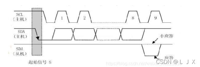 SL高时,SDA有一个高到低的跳跃;启动信号是电级跳到时信号,而不是电级信号。
