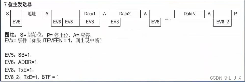 当SR1登记册中的ADR和TXE位数设置为 1 时,将创建 EV6 和 EV8 信号。ADD1 表示地址已经发送,TEX 表示数据登记册是空的。