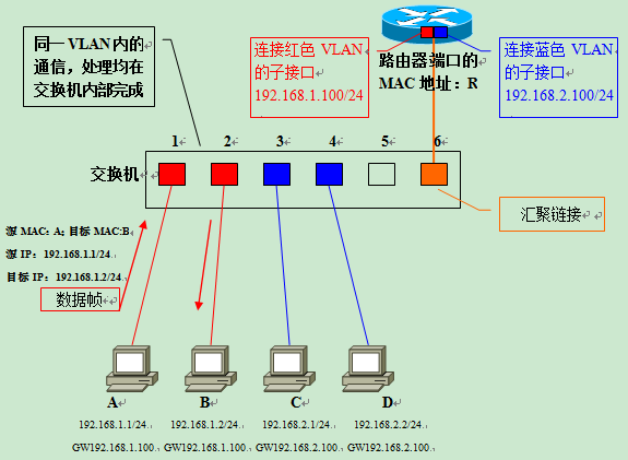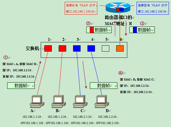 蓝VLAN是目标网络24此外,网络通过次界面直接连接路由器。所以我们现在要做的就是从蓝色VLAN分界面 把它转过来。这时,数据框架的目标MAC地址已改为计算机C的目标地址;目标MAC地址已改为计算机C的目标地址,因为有必要通过对流连接进行旅行。因此,增添了蓝VLAN的识别资料。图3说明了数据框架。
