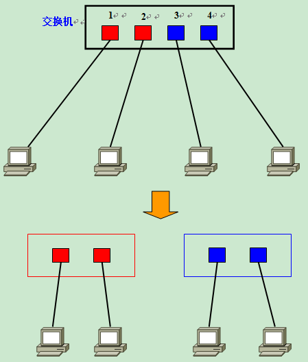 换句话说,VLAN可以被认为是许多交换器转换的逻辑分区。 在总机上创建两个红色和蓝色的VLAN,也可以被认为是用红色和蓝色的和虚拟的交换器取代开关。