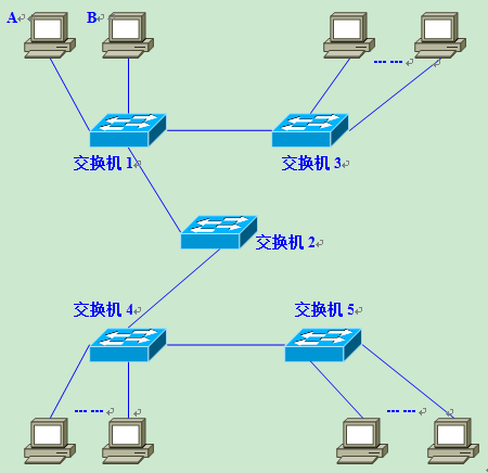 图中,它由五个二级开关(交换器1-5)组成的网络组成,与许多客户机构有联系。假设这时,电脑A必须和电脑B联系在以太网为基础的连接中要成功沟通,必须在数据框中提供目标MAC地址。因此,计算机A必须首先广播“ARP请求”(ARP请求)数据。试图获取机器B的MAC地址
