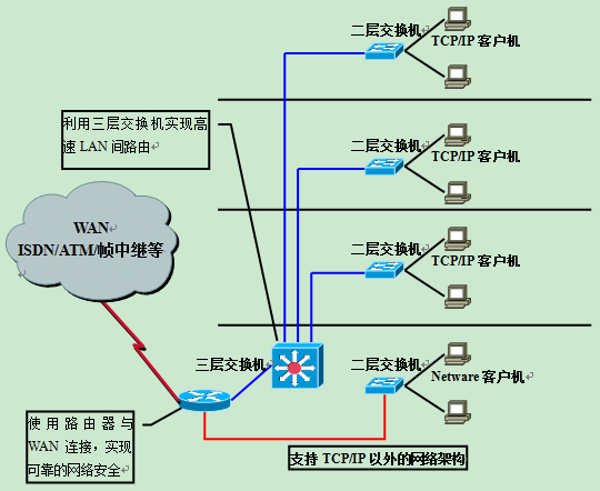 请记住,在几个高端开关上,它还支持上述路由器的功能。例如Cisco的6500系列催化剂,可选择与广域网连接的接口模块;基于 IPSec 的任择模块可用于提供 VPN;可支持TCP/IP以外的网络协议。