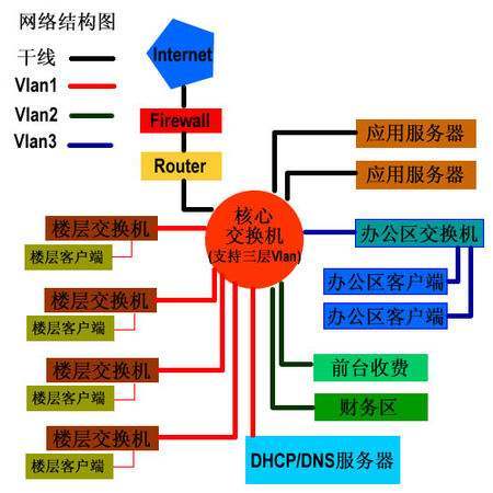 VLAN是利用所有楼层的二楼开关装置组成的,将TCP/IP客户计算机连接起来,通过三层开关的高速线路完成对层VLAN的通信,如果网络环境要求高度可靠,也可以考虑三层开关的冗余。