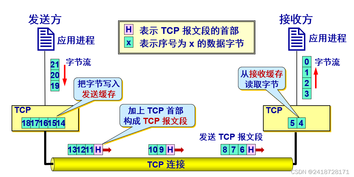 字节流意味着,虽然应用程序与作为数据块的TCP发生交互作用,但TCP仅将应用程序传递的数据视为一个字节。它由一系列无结构的字节流组成。。