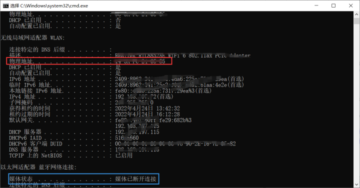 可能有错误。 我认为检查MAC地址是可行的。 它与某个网站相连 。宽带(以太网)或者wifi它是(无线局域网)下的实际地址。媒体状态“媒体断开”的部分没有实际地址,但本节中的信息相当宝贵。