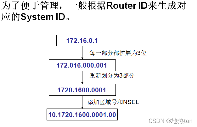 在实际应用中,在大多数情况下,路由器识别码被用来匹配系统识别码。假设路由器使用接口 loopback0 的 IP 地址作为更深的 ID,则可以使用接口的 IP 地址。ISIS使用的系统代号可通过以下方式转换: