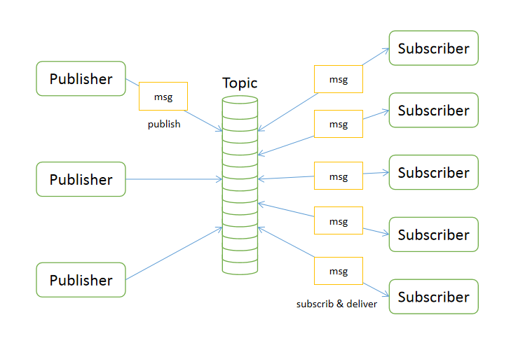 许多出版商向 " 专题 " 组织发送信息,然后有条不紊地将信息分发给许多订户。