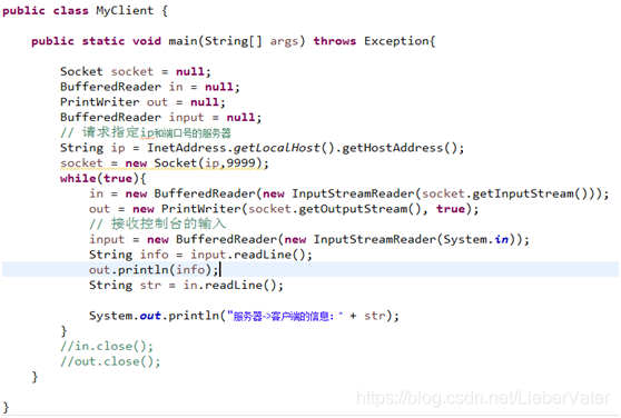 这就是双方完成沟通的关头。因此,投入流动被用来完成这项工作。这是对几个项目的选择 。为了完成读写输入流的内容缓冲阅读器类型和输入使用输入流系统。 对象被输入、 读取和读取到从服务器端发送的输入流对象 。PintWriter 类型的天体读取了从 Socket 输出流传输的材料 。计算机IP地址也采用了同样的程序。例如,Socket 对象含有IP和端口号。