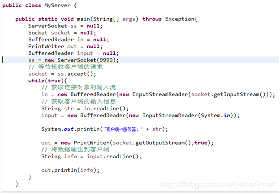 服务器端必须使用 ServerSocket 夸大插座 。还可以用它来区分双方在双向交流互动中的作用。使用一个膨胀的套接字对象监听服务器套接字端口,使用ServerSocket的接受功能监控索克特(Socket Socket),进入到循环中,通过客户描述的同样技术访问输入和输出流物体,并输出出来。