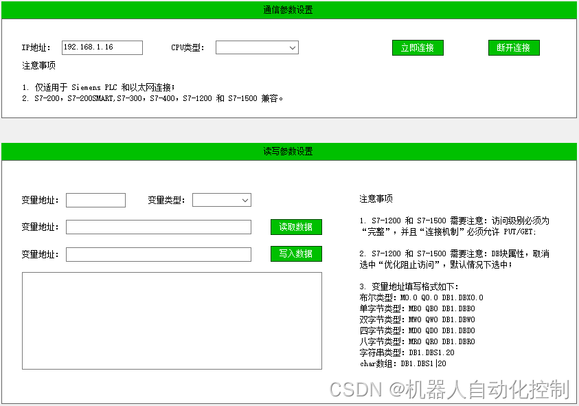在工业自动化领域,西门子PLC是一种共同控制。在连接较高级的机器接口时, 一般来说,经常使用组态软件。然而,较高的机器可以使用Westgate Wincc灵活机动或TIA。面对更多样化需求的要求,温奇是个假人而且,作为一种大规模生产的标准化产品,Winc的核定费用并不小。我不知道你在说什么,但我不确定你在说什么。 这是一个动态图书馆,用来与网络平台上的西门子 PLCs 进行沟通。你可以直接从GitHub那里拿到安装器