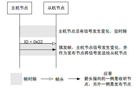 当主机节点的信号变化,主机任务传输时,主机节点发送时,当框架被主机节点接受时,主机节点发出信号,其余人决定是否根据自己的要求接收它(也由框架ID分析决定),提供主机节点的信号变化,主机任务传输时,主机节点传递时,当从主机节点收到框架时,主机节点发出信号,其余人决定是否根据自己的需要接收信号(也由框架ID分析确定)。