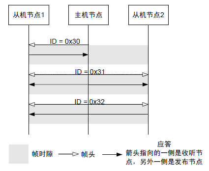 - 主机节点的主机任务向机器任务的所有框架( 包括主机节点) 发送框架, 机器任务分析 ID = 0x30 的所有框架, 决定是从框架发送数据还是接受框架的数据, 还是不处理数据 。