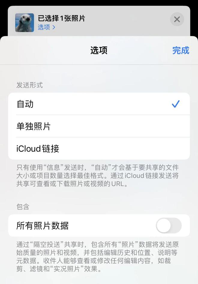 在 iOS 15 中, 作者的图片共享页面删除了“ 完整照片数据” 的复选框 。