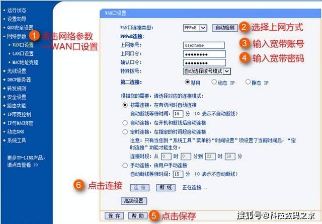 打开无线设置页面,输入用户名和密码登录,单击网络参数菜单,然后单击WAN端口设置。右广域网端口连接类型,单击PPOE,下面的账户号和密码,单独输入宽带账户号和拨号密码,然后单击下面的保存。